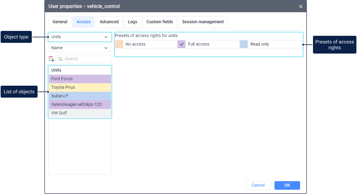 On this tab, you can see and change the access rights of the user to the following types of objects: