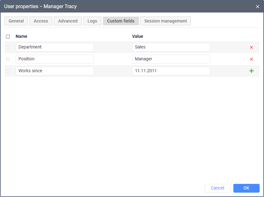 To view information on the Custom fields tab, the user must have the Read only access rights preset. To make and save changes on the tab, the user must have full access.