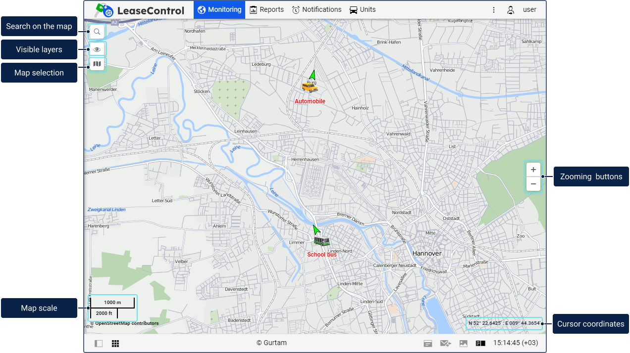 In the lower left corner of the map, the current scale of the map is indicated. In the lower right corner, you can see the geographical coordinates of the place the cursor points at. The coordinate format is selected on the Maps tab in the user settings and can be either degrees or degrees and minutes.