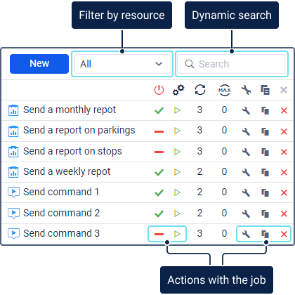 The work list shows all the available jobs. Above the list, there is a button for creating new jobs, a filter by resource where the jobs are stored, and a search.