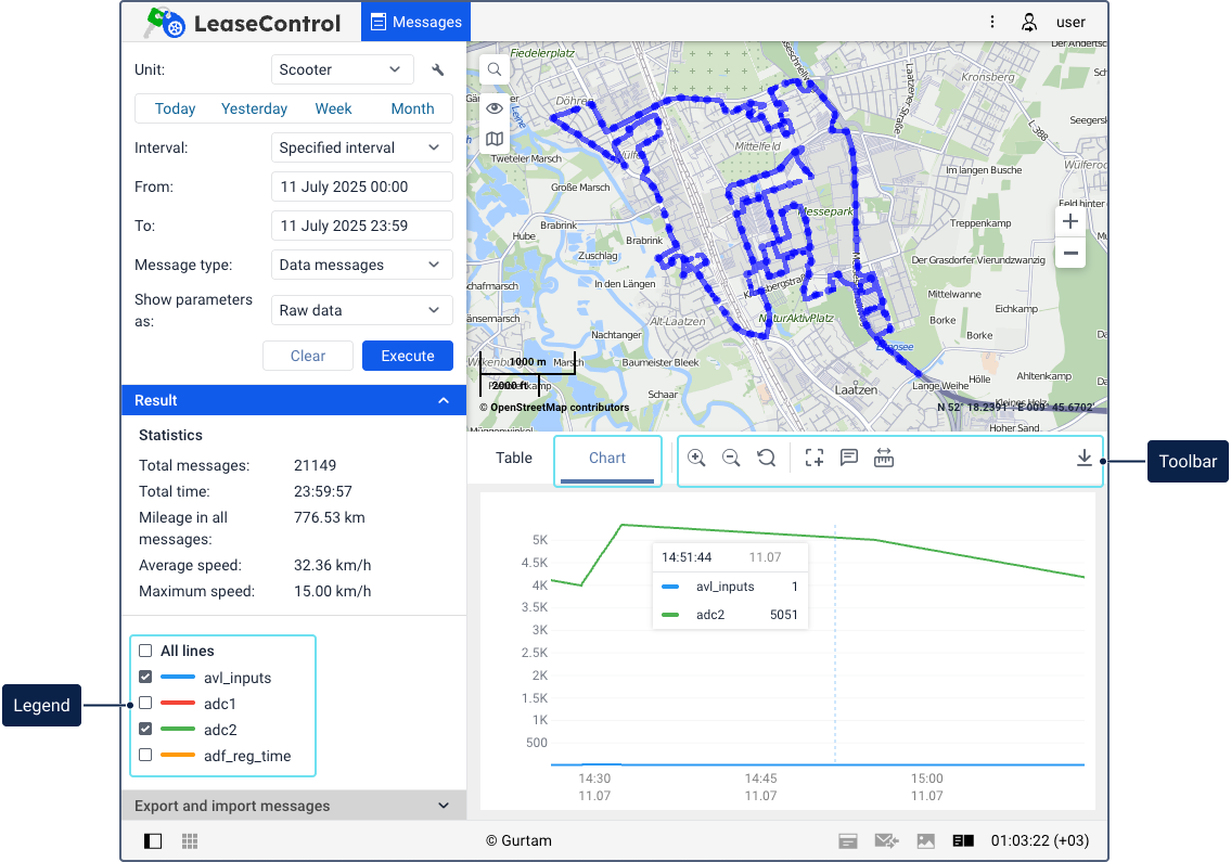 When working with the chart, its legend is displayed in the work area. Here you can select the lines which should be displayed in the chart. Each line corresponds to a specific parameter and has its own color. The color is selected automatically each time you request the messages. The lines of all the parameters are displayed in the chart by default. To remove a line from the chart, disable it in the legend. For disabling or enabling all the lines, use the All lines checkbox. To see only one line and remove the others, point to it in the legend and click Only this.
