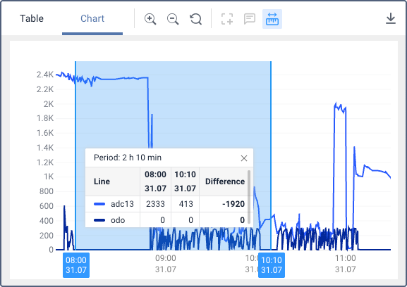 Show detailed information about points. Click on the icon to see tooltips with information from the unit messages when you point to the chart points. If a tooltip contains coordinates, then when you click on them, it is possible to go to the map of a third-party source. See more.This tool is unavailable when using the Compare data tool. |