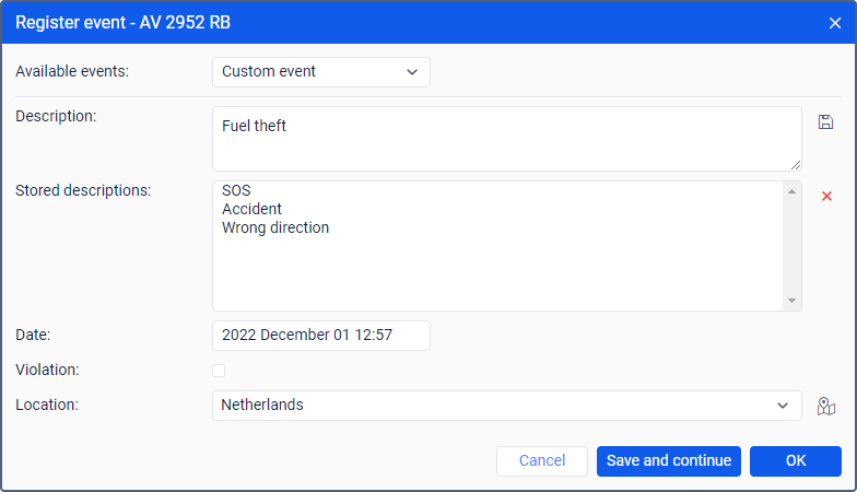 The description of the registered event can be saved. To do this, click on the Save icon to the right of it. The saved description appears in the list below. To select an existing description, click on it. To delete a description from the list, select it and click on the Delete icon.