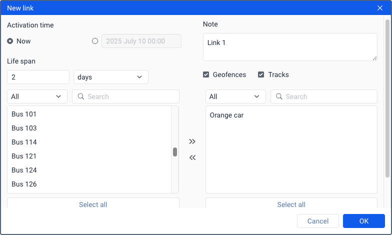 You can also check the Geofences box here to share them in the link. Moreover, you can provide the possibility of generating and viewing the track of a unit by activating the Tracks checkbox.