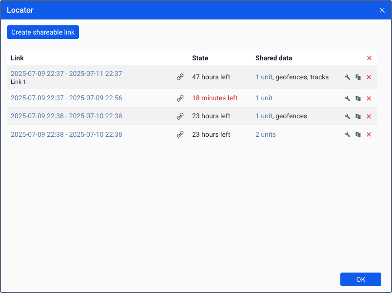 Generated links get in the corresponding list containing such information as the start and end time of its operation, how much is left before the expiration date (if the activation time has already come), the number of units, as well as whether geofences and tracks are shown on the map of the locator. When you hover the cursor over the number of units, its list is shown in the tooltip. If there is less than one hour left before the link’s expiration, the corresponding line is highlighted in red.