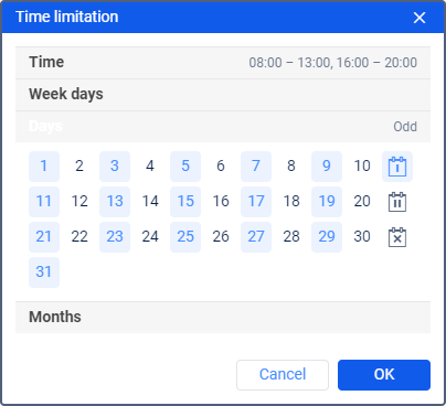 Section Description Time Specify, during what time interval the notification parameters should be controlled within the day. You can specify two time intervals. To make the interval fields active, check the box next to them. Week days Select the days of the week on which the notification parameters should be controlled. Days Select the dates on which the notification parameters should be controlled. To select all the odd or even dates at once, click on the icon or , respectively. To clear the selection, click on the icon .
