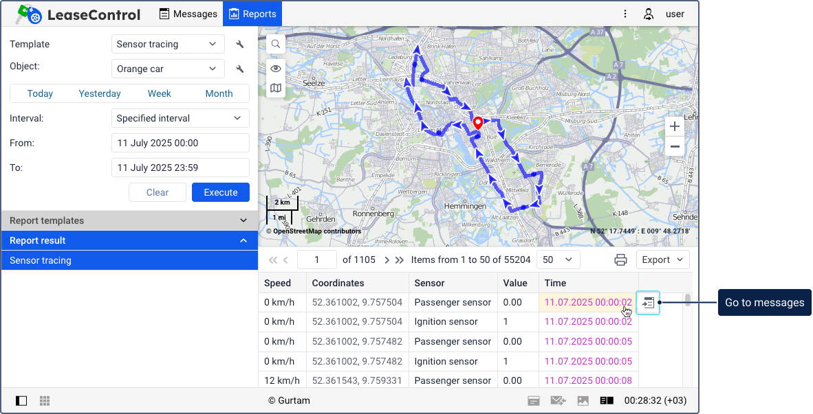 From a report table, you can navigate to messages and their corresponding points on the map.