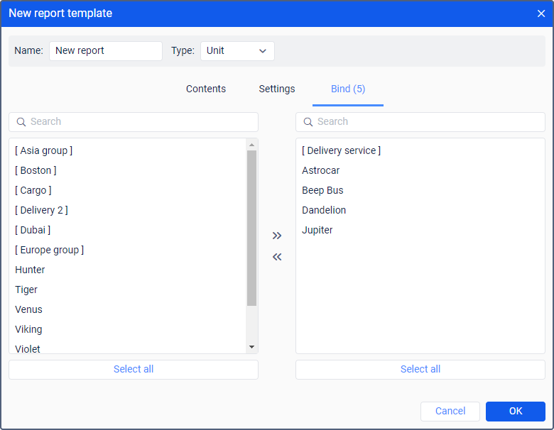 A report template can be bound to units or its groups. Binding allows you to restrict the list of items for which the report is run.