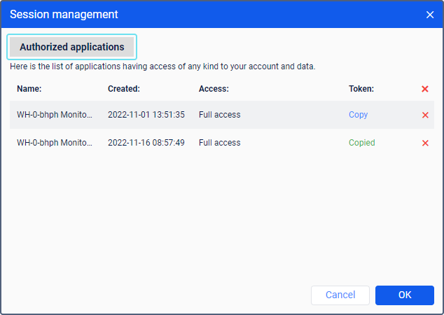 The Session management window shows the list of applications that have access to your account. The list is formed automatically after logging in to the application.