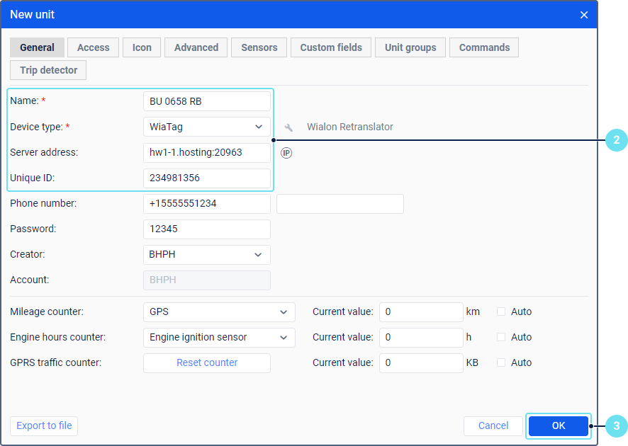 If the device type specified in the WLP file is not available for your account, then the device type of the created unit is automatically changed to Wialon Retranslator.
