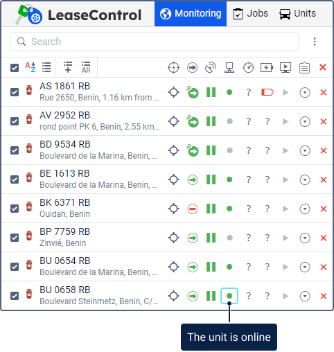 Go to the Monitoring tab to which the created units are added automatically. Make sure the unit is connected and is sending messages to the system. In this case, a green marker is shown in its row in the Connection status column of the list.