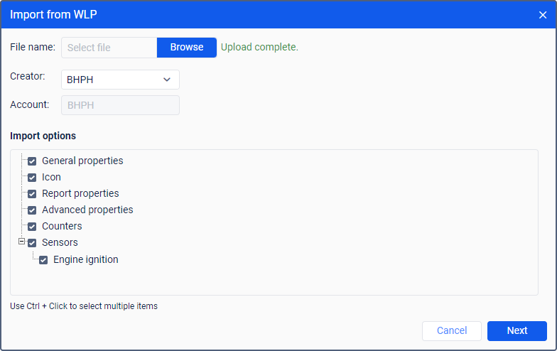 If you have a WLP file with saved unit properties, you can create a unit with the properties already configured. To do this, click Create from WLP, select the file and the settings you want to add to the unit properties, and click Next.