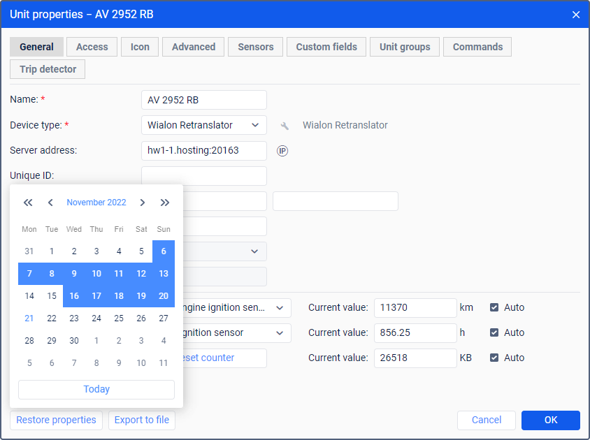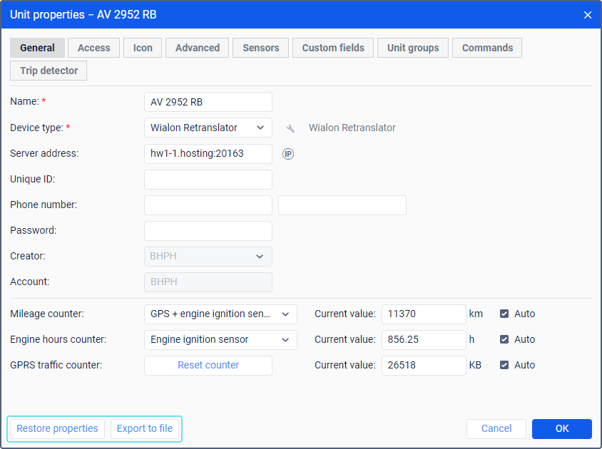 If you change or delete data on a certain tab of the unit properties by mistake, you can restore it. The settings of the properties saved in the last 14 days are available for recovery. These settings are saved automatically on a separate server once every 24 hours.
