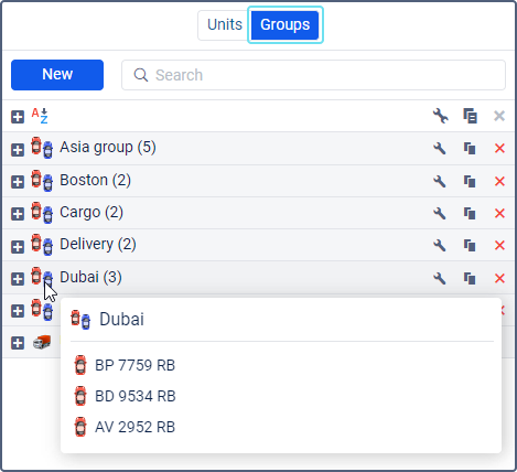 The created group is automatically added to the list of all unit groups and to the work list on the Monitoring tab (the group view) in the account to which it belongs. To search for groups, you can use the dynamic filter.