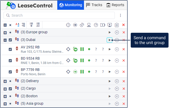Depending on the options enabled on the Monitoring tab, you can switch to the group view and see the parameters of all the units added to the group (for example, data recency, connection state, etc.) and send a command to all of them at once.