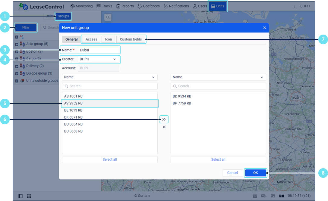 You can add the created units to groups. They allow you to group units according to certain criteria. In addition, you can use groups to grant access rights to several units at once. To do this, the creator of the group should have access rights to all the units added to it.