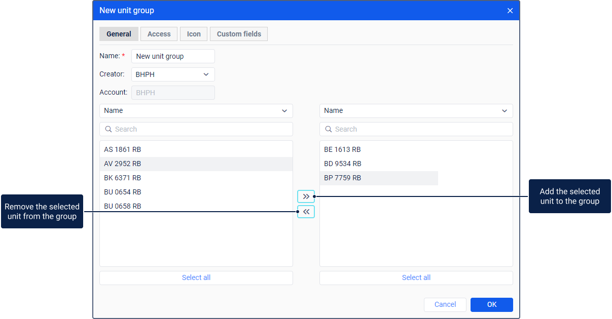 Units | The left list shows all the available units. The right list shows those units which have already been added to the group. To change the number of units added to the group, you should have full access to it. To quickly search for units by name, use the dynamic filter. To search by other unit properties (for example, unique ID, device type, etc.), select the corresponding option in the drop-down list above the search. To add a unit to the group, move the unit from the left list to the right one; to remove, vice versa. To move units, use the icons / or double-click on the selected units. To select several units, hold down Ctrl and select the required ones. To select all the units in the list at once, click Select all. |