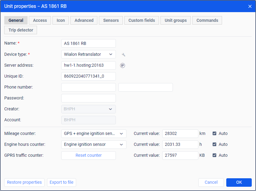 The window of unit properties is shown when creating, editing, and copying a unit. In this window, you can specify different unit properties, configure access to the unit, create sensors, and so on.
