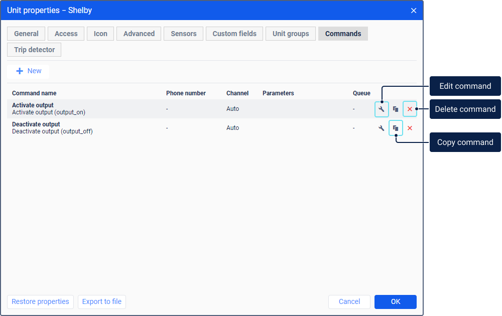You can perform the following actions with commands: clearing the queue, editing, copying, deleting, and sending. The first four actions are available directly in the list of commands in the unit properties.