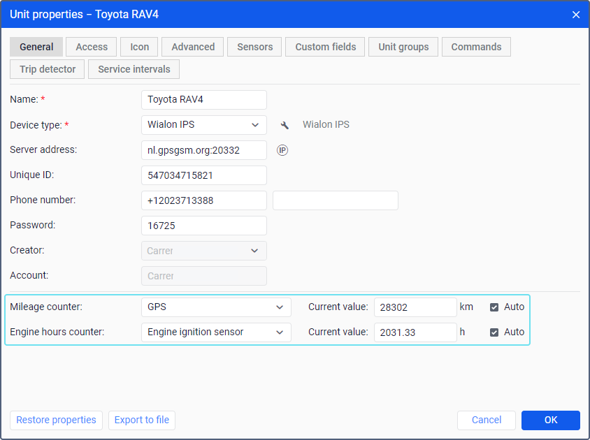 On the General tab, apart from other properties, you can configure the mileage and engine hours counters.