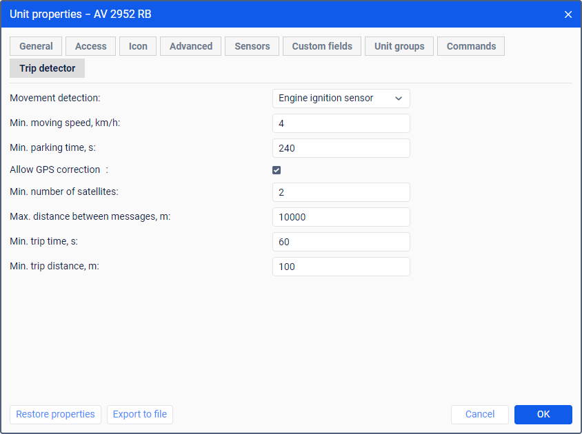 | Min. trip distance | Specify the minimum distance in meters which the unit should travel so that its movement is considered a trip. This is required in order to exclude possible equipment errors when determining the unit location. |