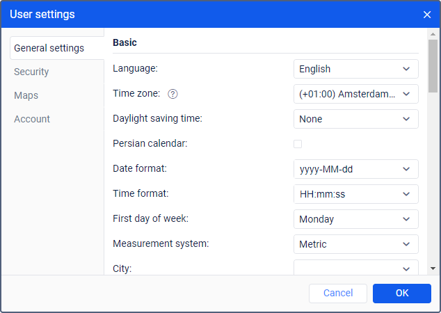 The first tab of the User settings dialog contains general settings. Here you can indicate your time zone, change the password to enter the system, and set many other parameters.