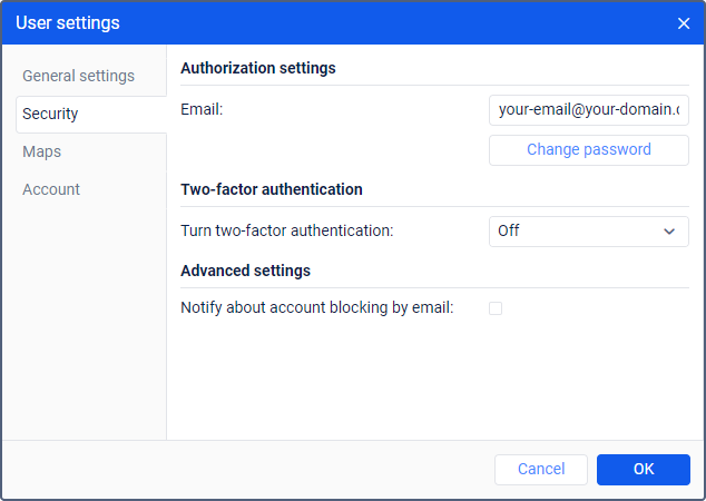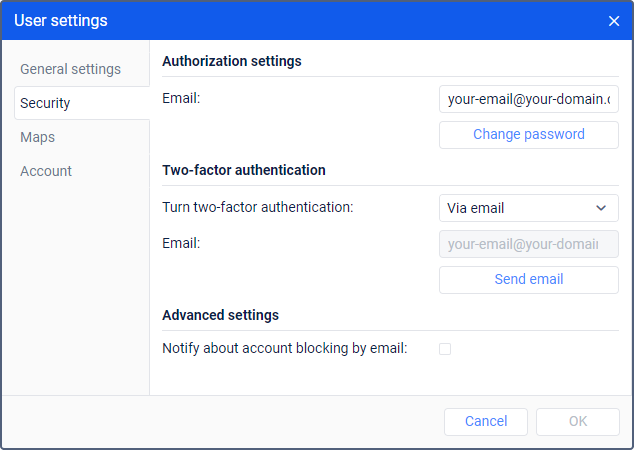 To enable two-factor authentication, in the drop-down menu select the method of receiving the confirmation code: via email.