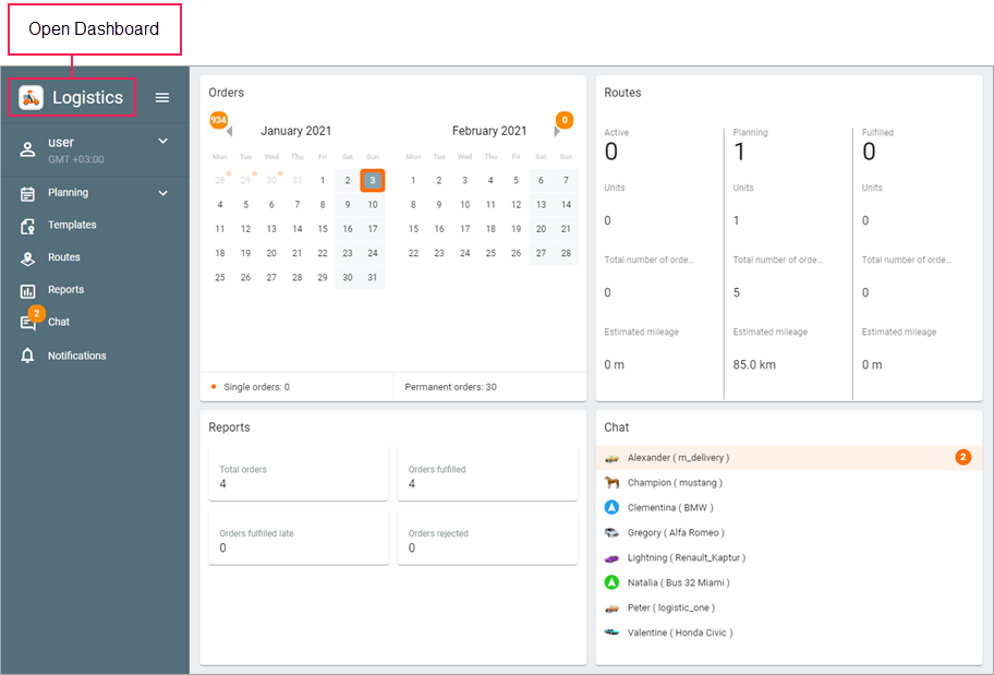 The block contains a list of all drivers. When a driver’s message is received, the line with the driver’s name is highlighted in orange and the number of unread messages is displayed. After clicking on the line, the Chat page opens.