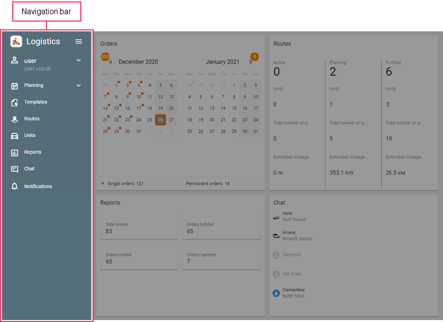 In the upper part of the navigation bar, you can see the application logo after clicking on which the Dashboard page opens. This page is displayed by default after you sign in to the application.