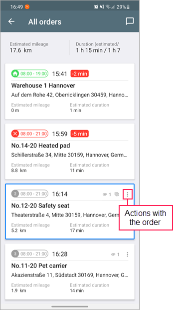 After tapping the route card, you can see the list of all points it consists of (including warehouses). Here you can see information about route points, indicate their status, and perform other actions.