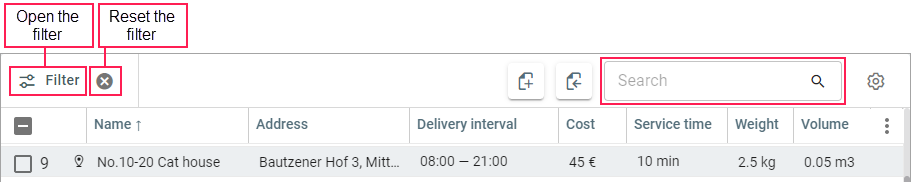 There is a filter and a dynamic search in the toolbar above the table to facilitate the search of the items.
