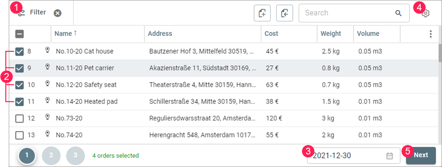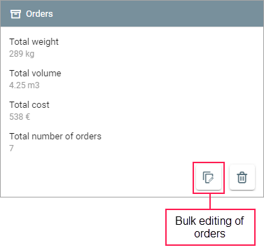 If you select several orders, the information block shows the total weight, volume, cost and number of the selected orders.