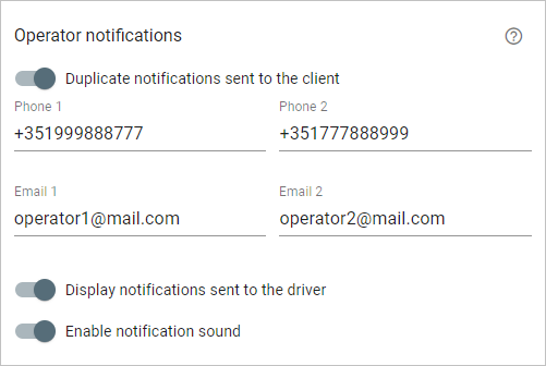 To do this, you should enable the Duplicate notifications sent to the client option and specify the email address and/or phone number of the operator. You can specify two email addresses and two phone numbers at once.