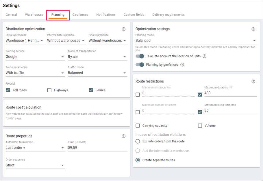 The settings in this section influence the level of expenses related to the fulfilment of routes. The section also contains the options which allow taking into account the location of the units and their attachment to geofences while planning.
