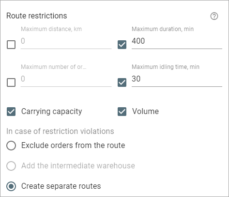 If you specify the Carrying capacity and Volume parameters in the unit properties, but the same-name options are disabled, then the route is planned without taking these restrictions into account. The orders that exceed the specified parameters are marked with the warning sign