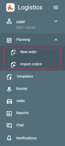 To open the menu for working with orders, expand the Planning item in the navigation bar.