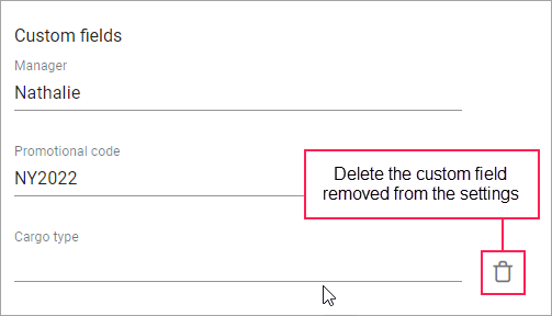 If you have saved a custom field in the order and then deleted it in the settings, it remains in the order. If you want to delete it, point to the line with the field and click on the icon