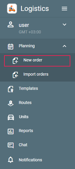 To create an order, select New order in the Planning item of the navigation bar.