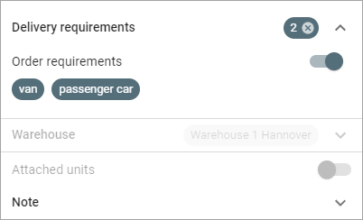 | Delivery requirements | A filter by delivery requirements specified in the order parameters and in the window for editing unit properties. All the requirements specified in the selected orders are selected in the filter by default. If an order has several requirements, they are shown in one tag. The table displays only those units that meet all the selected requirements at once. |