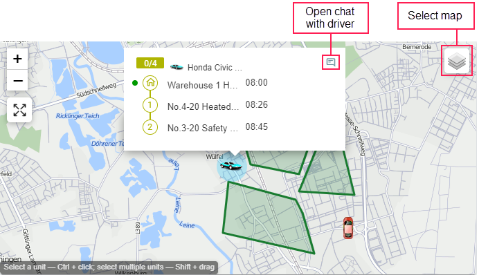 After clicking on a unit, you can see its name and an icon for going to the chat with the driver assigned to this unit. Besides, a coloured rectangle displays the number of fulfilled and planned orders for the unit.