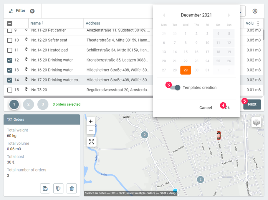 To create a route on the basis of a template, select it in the table, choose a date and click Start routes. After that, the route will appear on the Routes page among the planned or active routes.