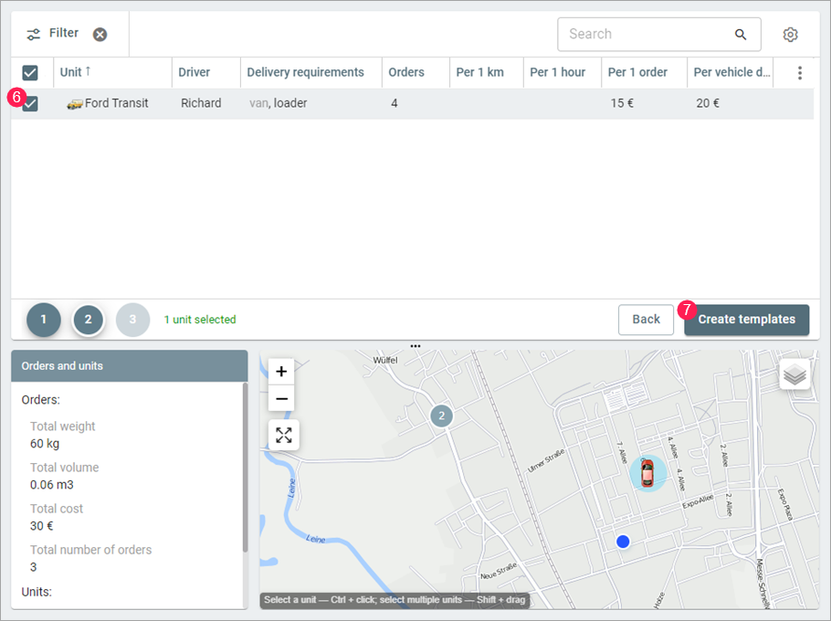 This page displays templates for creating routes. You can use them if you should create similar routes regularly. A template stores information about the route points and the assigned unit.