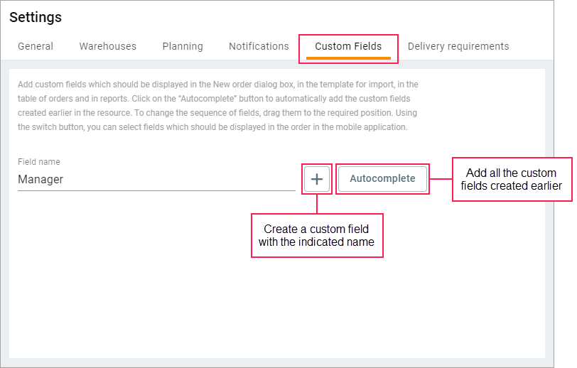 To display a custom field in orders in the mobile application, point to the line with the field and activate the switch.
