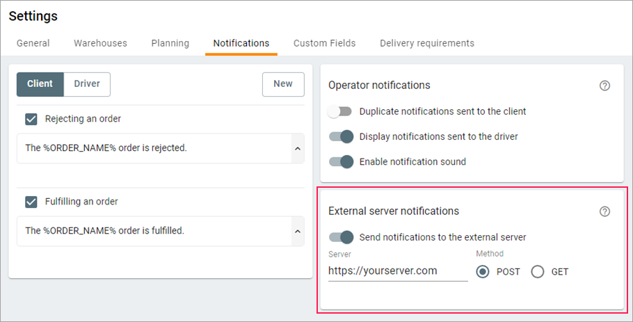 This section contains settings for sending notifications to an external server. You can use them if you integrate Logistics with external systems.