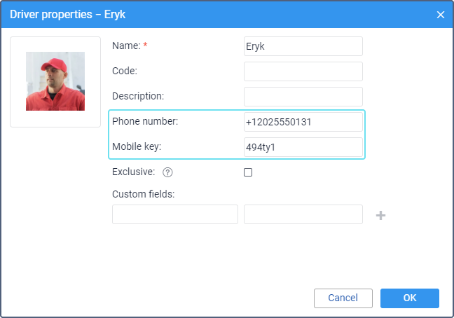 In the driver properties, fill in the Phone number and Mobile key fields.