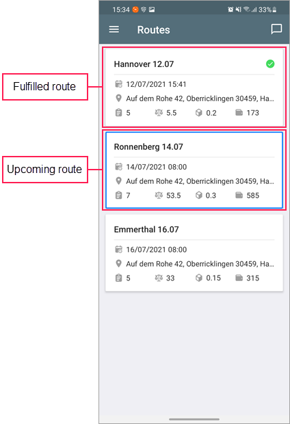 . The route is considered fulfilled if all its orders have been visited or a status (confirmed/rejected) is indicated for them.