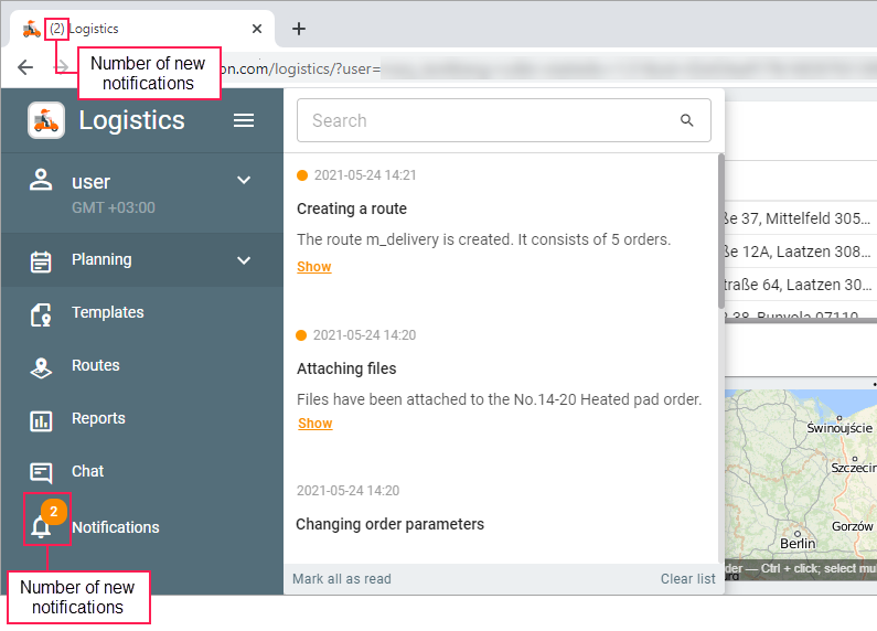 New notifications are indicated by an orange marker. Clicking on the Show button opens the Routes page where the route or order from the notification is highlighted by colour. The notification for a route or order which has been deleted or already stored in the history does not have the Show button.