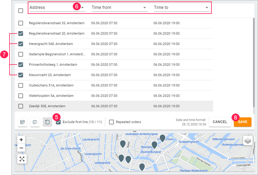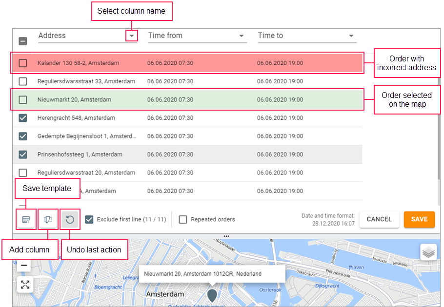 After the import, the data from the file is shown in a table. In the table, you can select orders and edit their data. The names of the columns and their contents correspond to the fields of the order creation/editing window, that is, these fields will be filled in after you save the imported orders. If some data is missing in the import table, the fields in the orders are filled in automatically with the values specified on the General tab of the settings (the Order parameters section). In the empty Time from and Time to columns, the time is automatically indicated for permanent orders, while the date of the next day and time is indicated for single ones.
