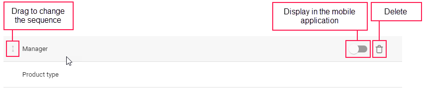 To display a custom field in orders in the mobile application, point to the line with the field and activate the switch.
