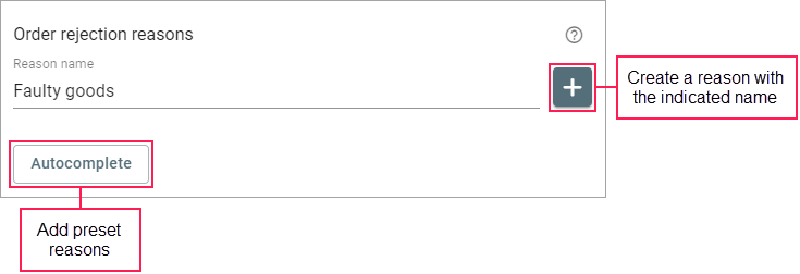 To create an order rejection reason, enter its name in the line and click on the icon .